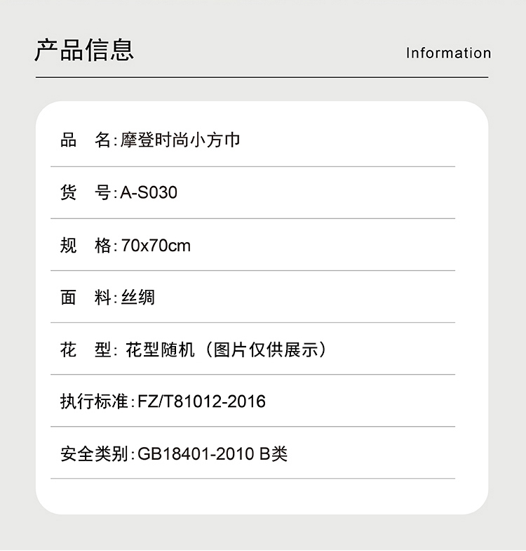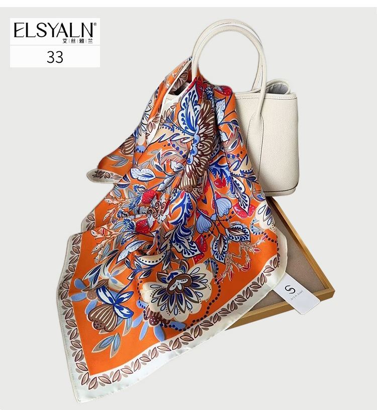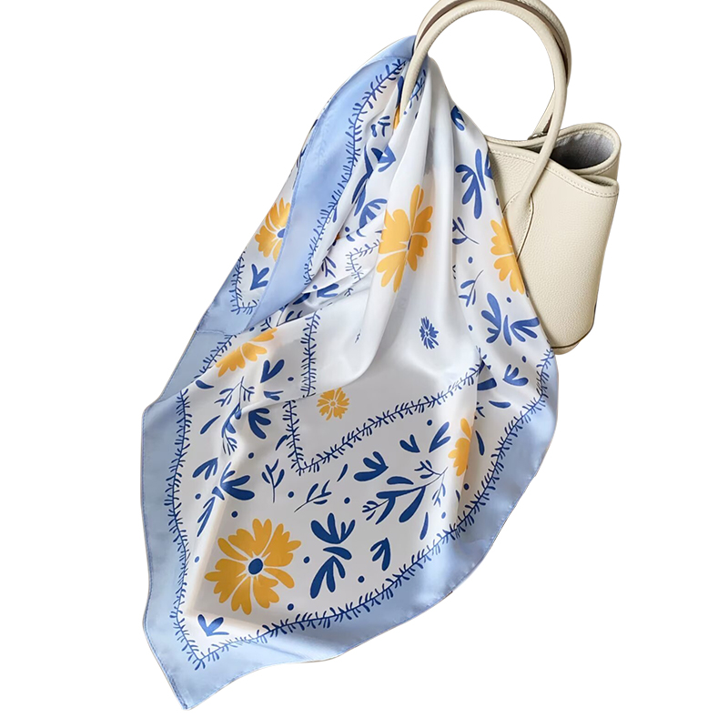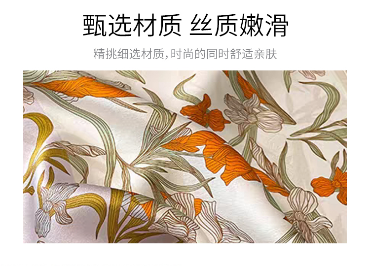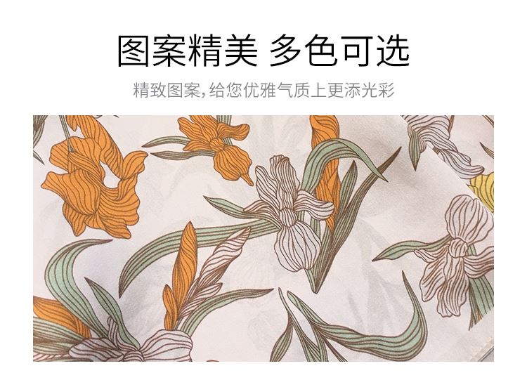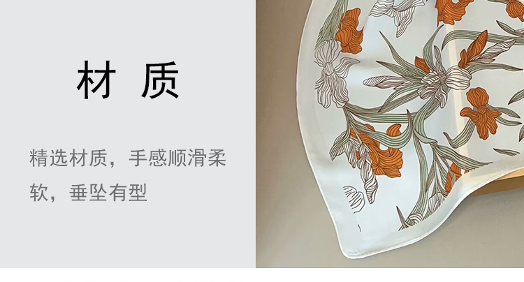 尺寸:70*70 面料:絲綢 1.時尚配色,優(yōu)雅氣質(zhì)。 2.精挑細(xì)選的面料,舒適親膚。 3.環(huán)保印染、色彩牢固、色澤鮮艷。 4.手感順滑柔軟,垂墜有型。 5.圖案精美,多色可選。