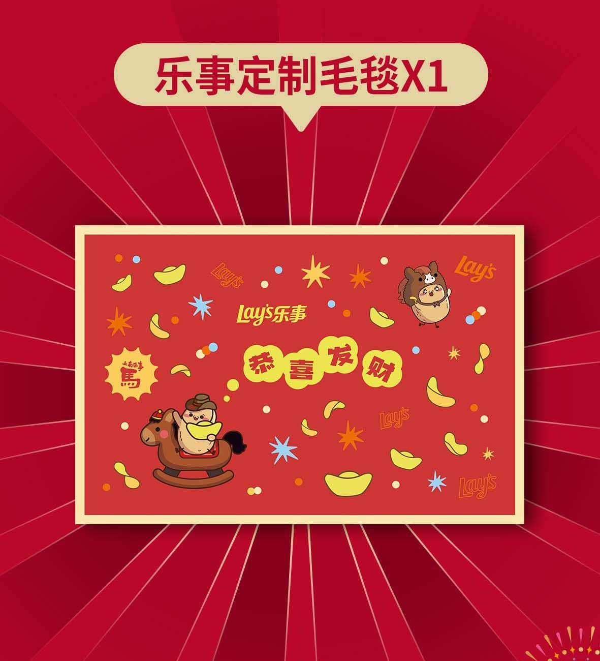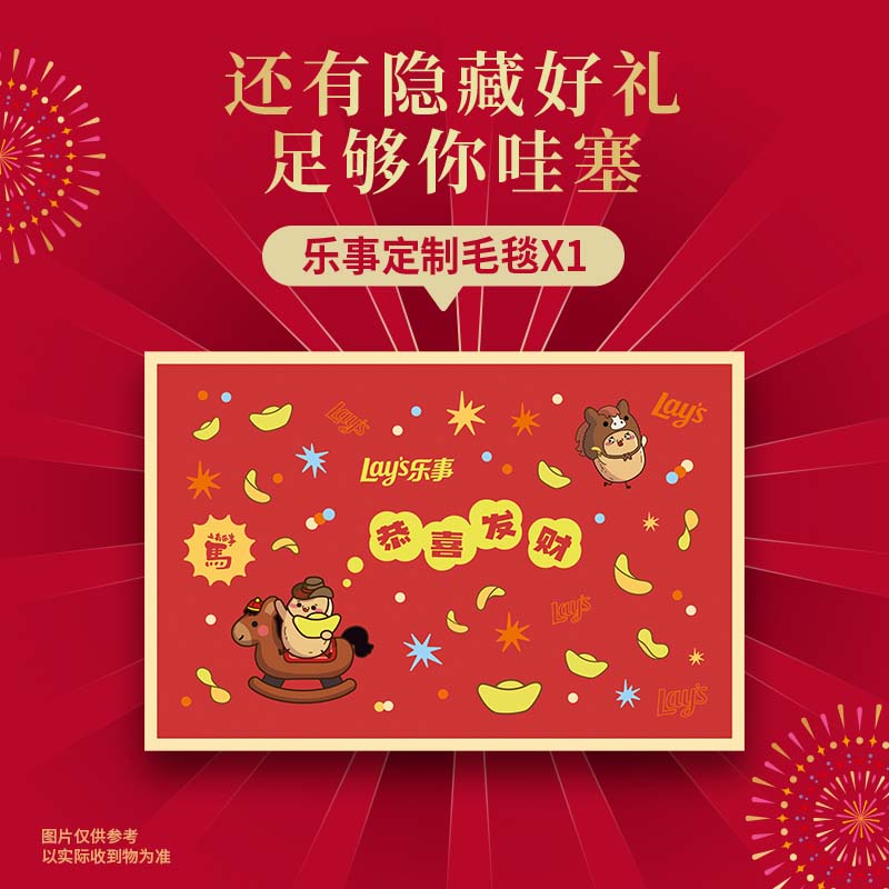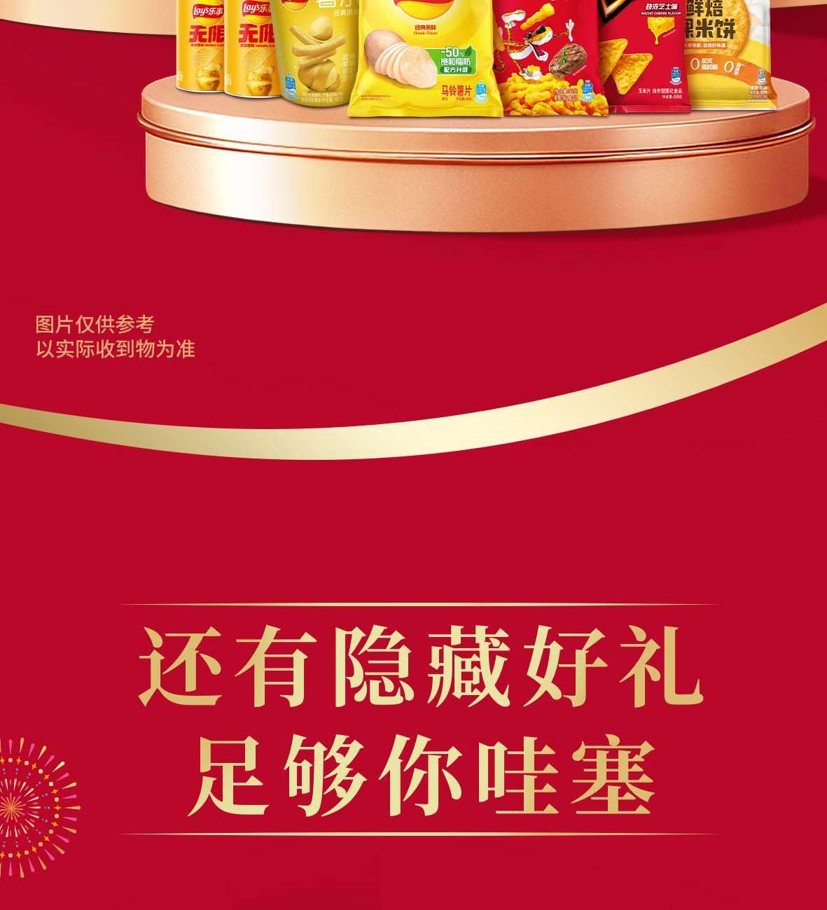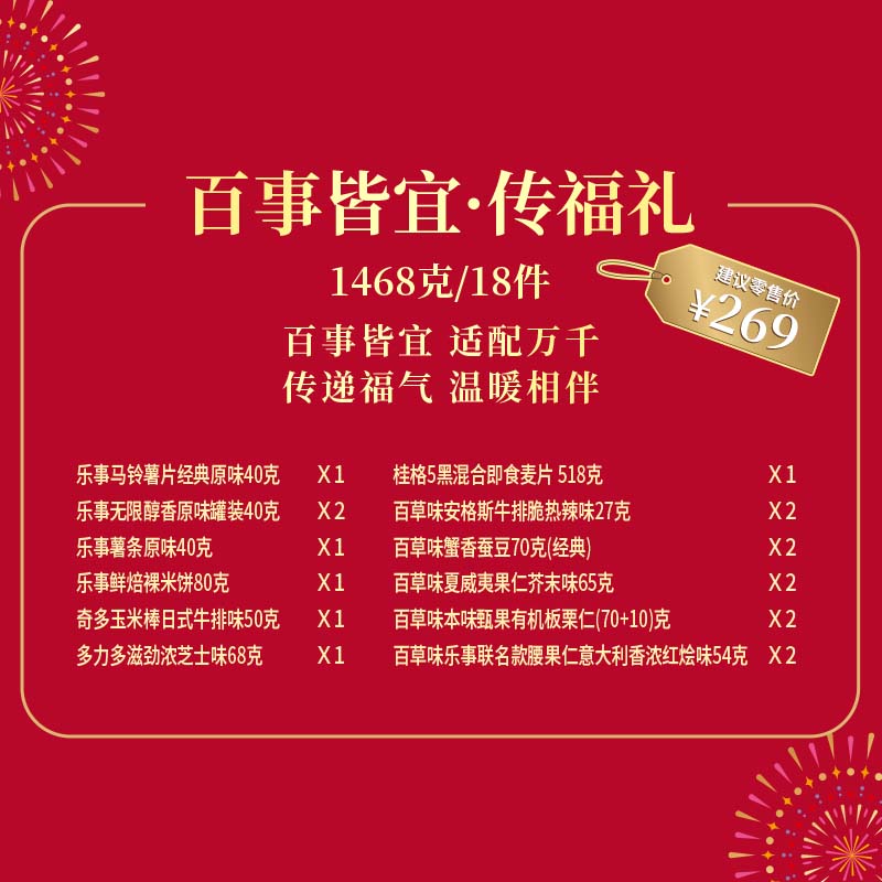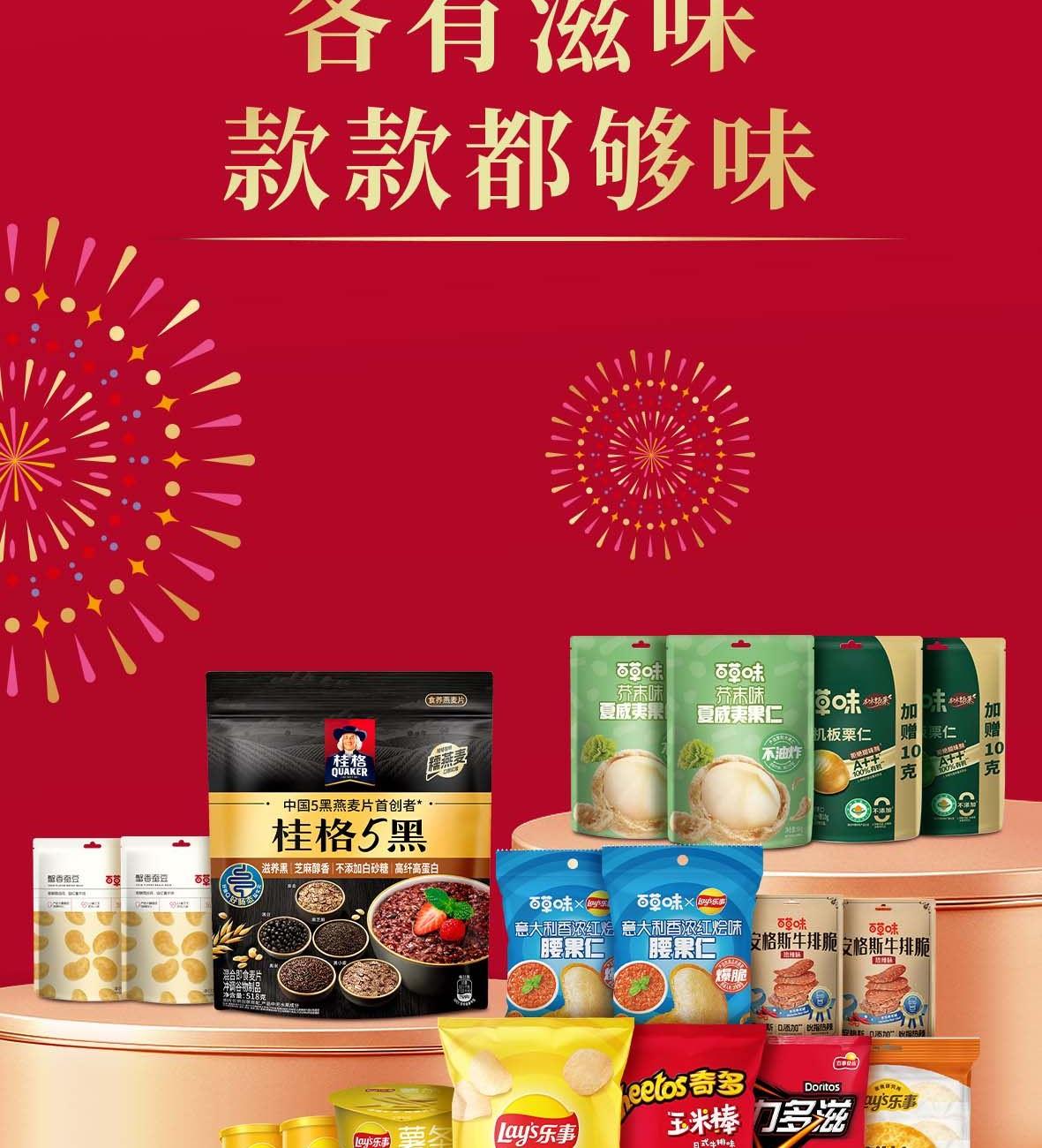 1 X 樂事經(jīng)典原味40克 2 X 樂事無限醇香原味罐裝40克 1 X 樂事薯條原味40克 1 X 樂事鮮焙裸米餅80克 1 X 奇多日式牛排味50克 1 X 多力多滋勁濃芝士味68克 1 X 桂格5黑混合即食麥片 518克 2 X 百草味安格斯牛排脆熱辣味27克 2 X 百草味蟹香蠶豆70克(經(jīng)典) 2 X 百草味夏威夷果仁芥末味65克 2 X 百草味本味甄果有機板栗仁(70+10)克 2 X 百草味樂事聯(lián)名款腰果仁意大利香濃紅燴味54克 贈品:定制毛毯