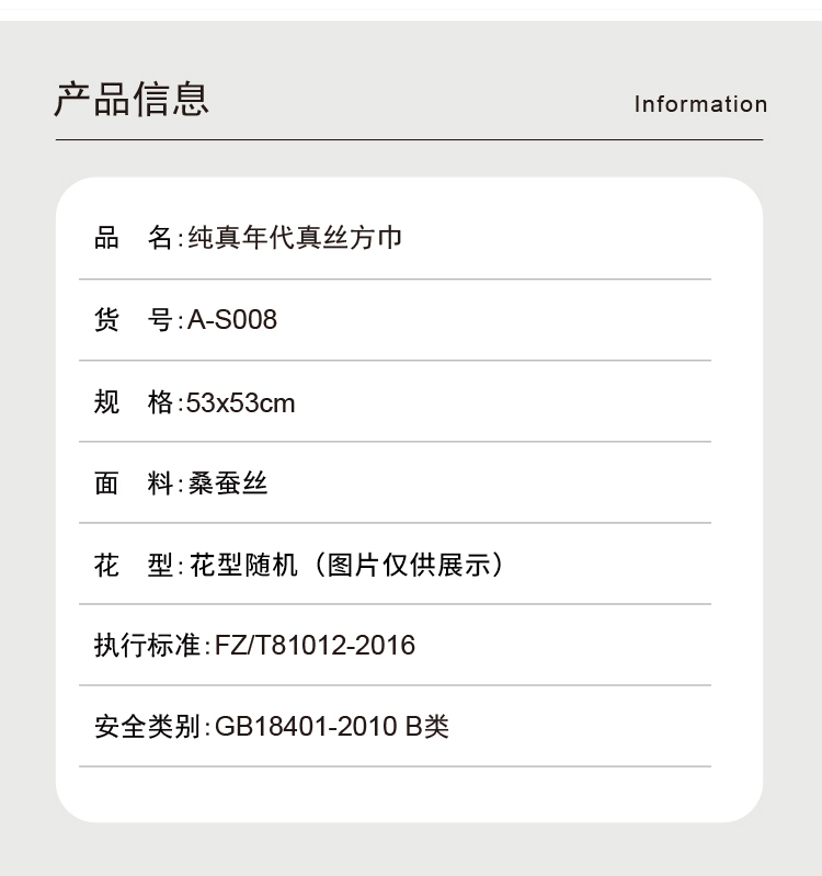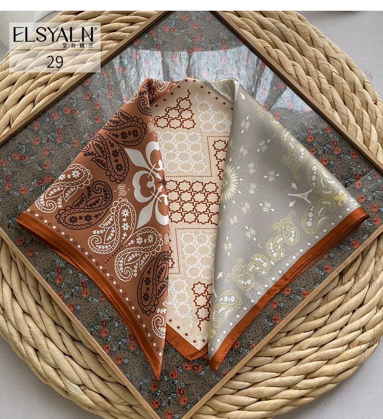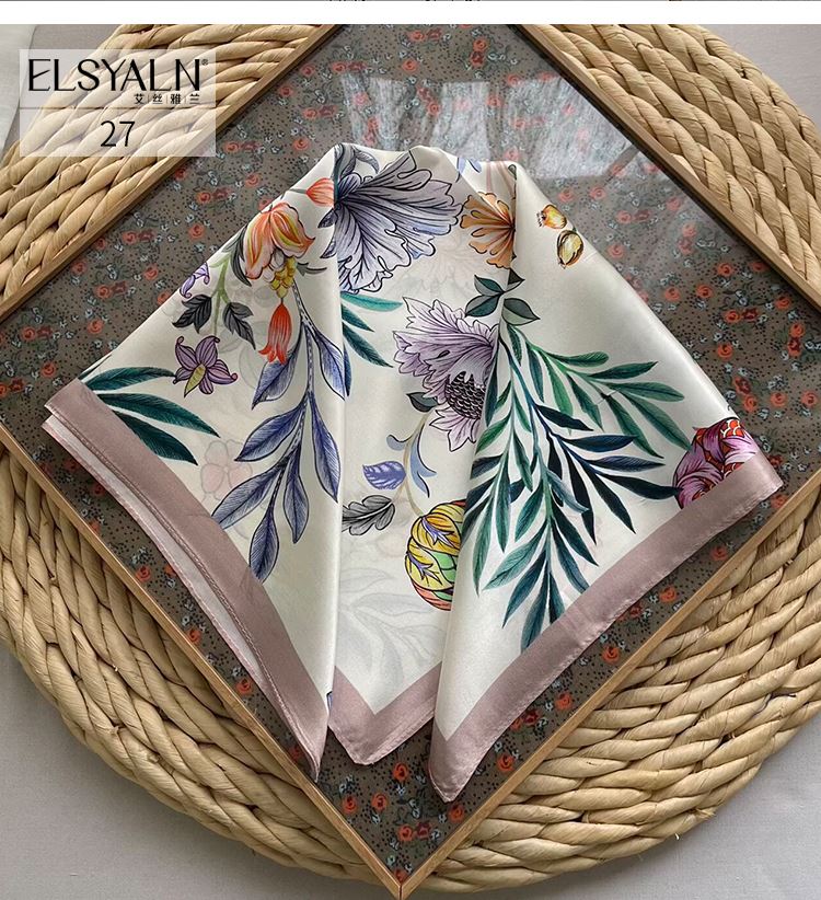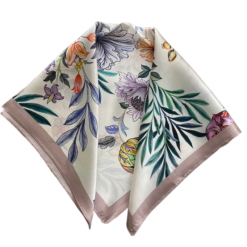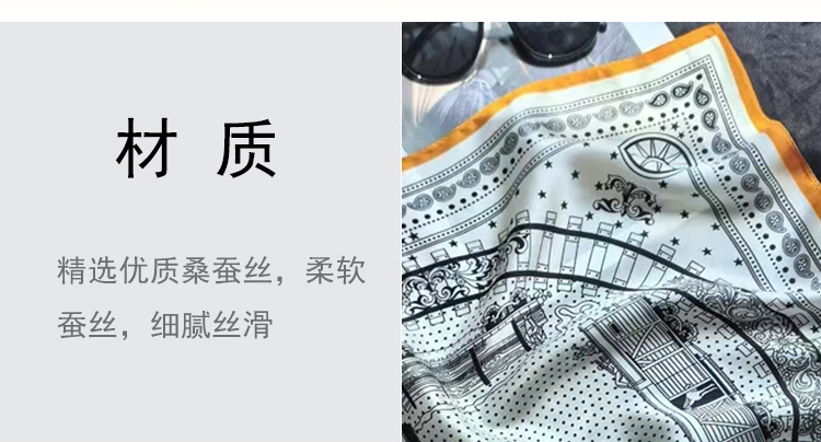 尺寸:53*53cm 面料:桑蠶絲 1.精選高品質(zhì)桑蠶絲面料,輕柔絲滑。 2.環(huán)保印染、色彩牢固、色澤鮮艷。 3.手感順滑柔軟,垂墜有型。 4.圖案精美,多色可選。