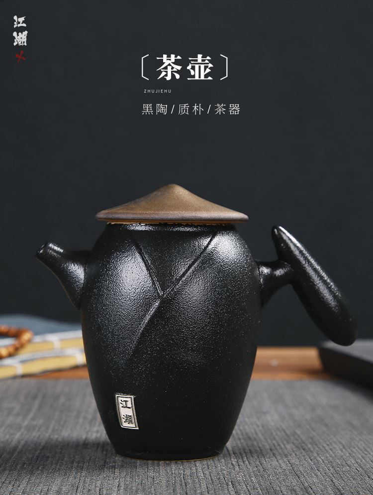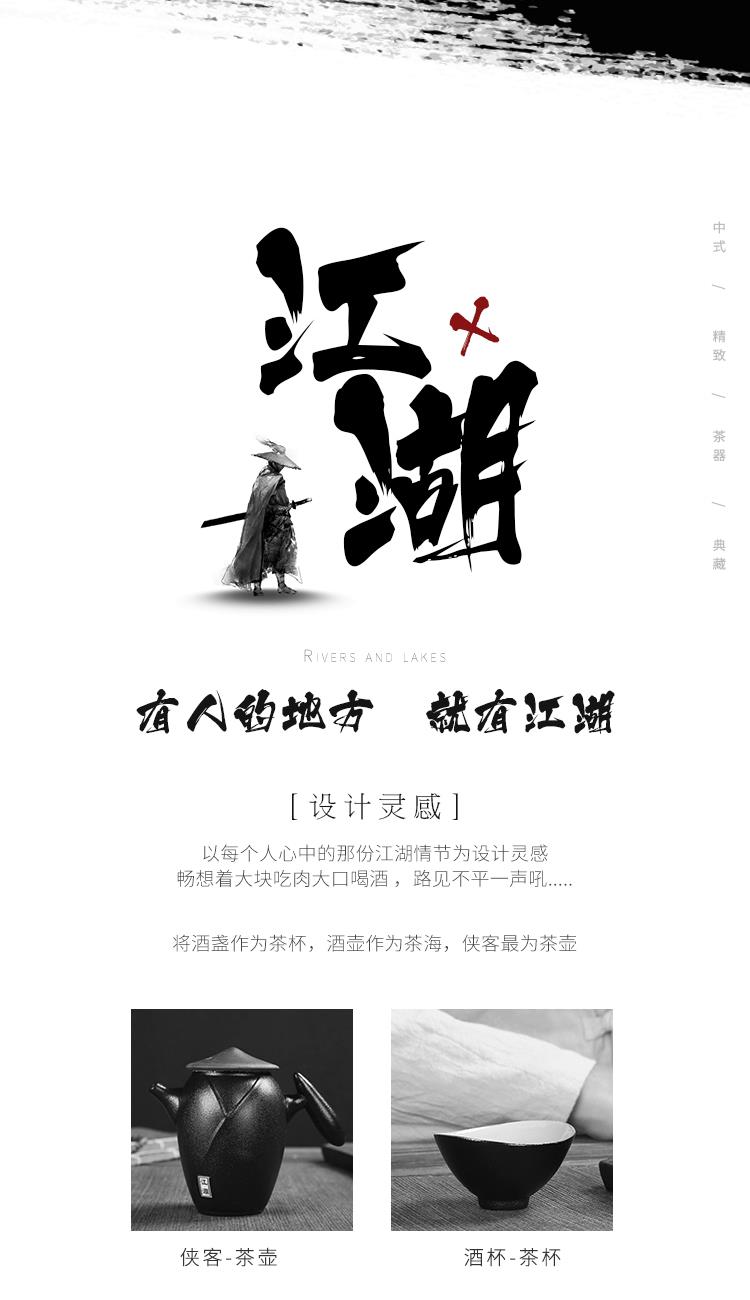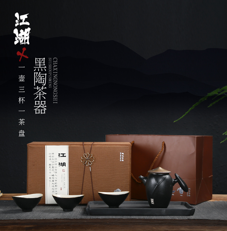 《江湖-五件套黑陶干泡茶具套裝》 中國風(fēng)產(chǎn)品符合當(dāng)下熱潮,設(shè)計以俠客為器型,體現(xiàn)江湖主題。每一個人都是單槍匹馬闖蕩這個世界,帶著七分豪氣三分膽氣。每個人心中都有那份大口吃肉大口喝酒的江湖情懷。 材質(zhì):黑陶、陶瓷 配置:茶壺*1+茶盤*1+茶杯*3+禮盒+手提袋