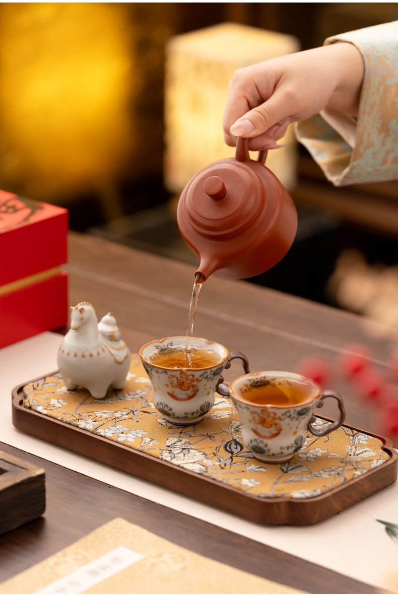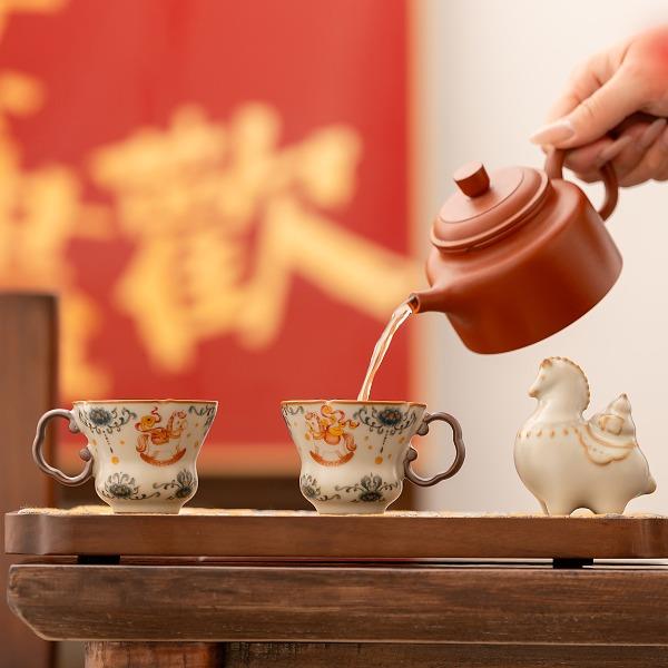 配 制:2杯 1擺件 1禮盒 手提袋 材質:汝黃瓷 規(guī)格:杯子 6*9cm 碟子直徑9.3cm高1.8cm 擺件9.3*7cm 容量:70ml 推薦說明:馬年開門紅禮品,馬上有錢,馬到成功杯子擺件套裝,馬背上葫蘆造型,寓意福祿。亞黃汝瓷,瑪瑙入釉,蟬翼開片,家有千財萬貫,不如汝窯一片。技術新品。畫面堆料技術,富有立體浮雕質感,真實感強。杯身開片,可養(yǎng)瓷。