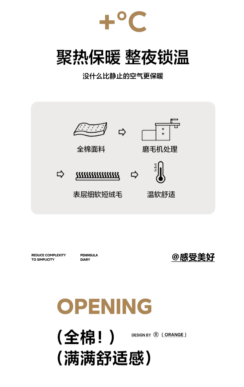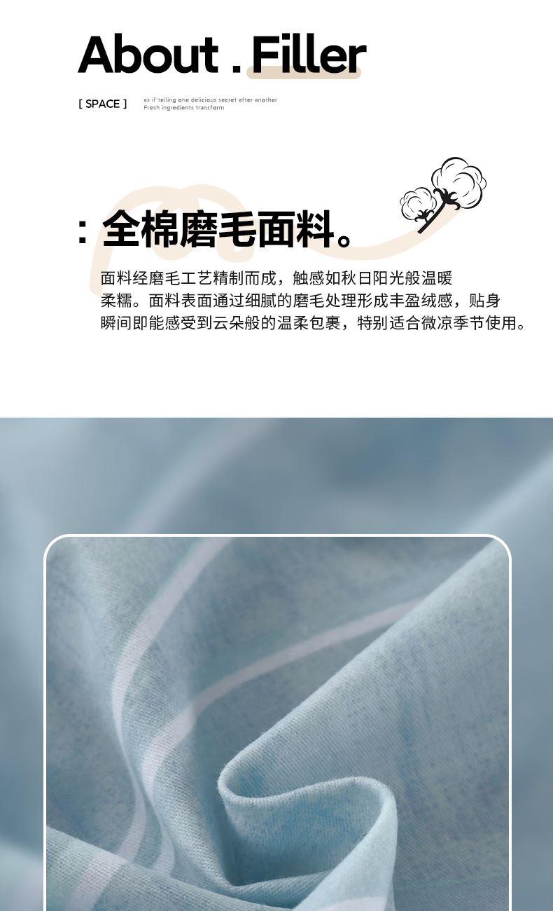 1.面料經(jīng)磨毛工藝精制而成,觸感如秋日陽光般溫暖柔糯。面料表面通過細(xì)膩的磨毛處理形成豐盈絨感,貼身瞬間即能感受到云朵般的溫柔包裹,特別適合微涼季節(jié)使用。