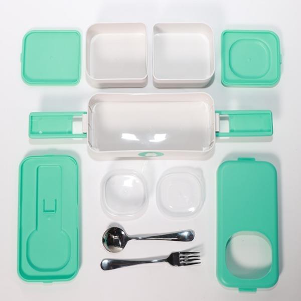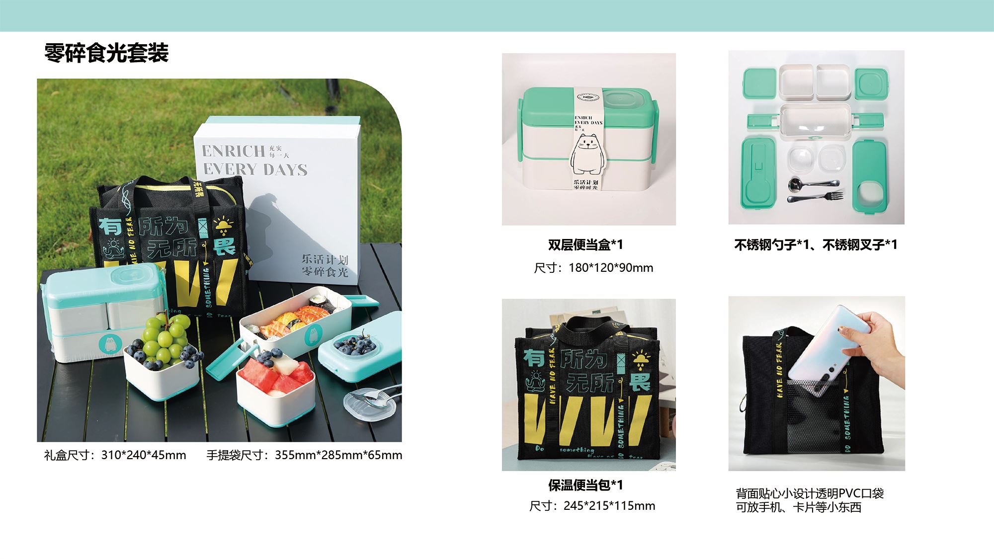 包裝盒*1 、手提袋*1 、保溫便當包*1 雙層便當盒*1、不銹鋼勺子*1、不銹鋼叉子*1