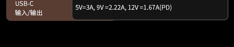 Type-C輸出:5V-3A/9V-2.22A/12V-1.67A