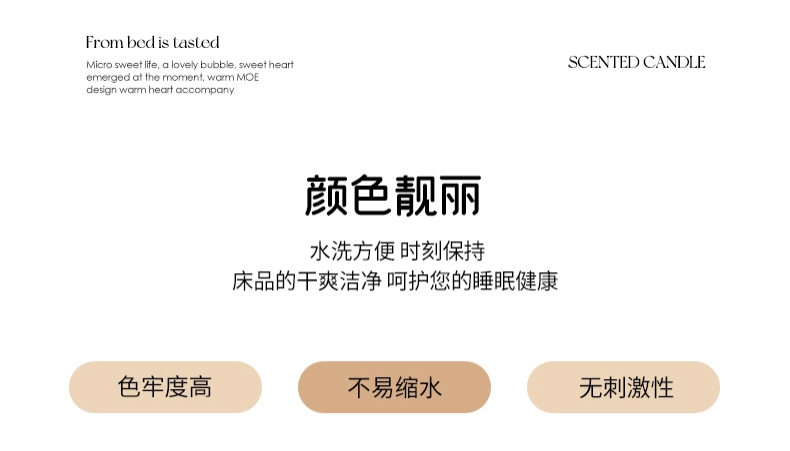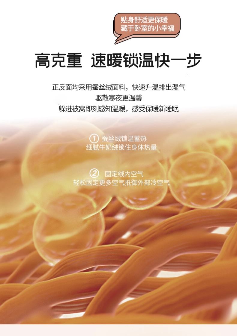 被套:200*230cm 床單:240*245cm 枕套:48*74cm*2 面料:蠶絲絨 執(zhí)行標(biāo)準(zhǔn):GB/T22796-2021 安全類別:GB18401-2010 B類 “蠶絲絨”是自然界中集輕、柔、細(xì)為一體的天然纖維,素有"人體第二皮膚"的美譽(yù),被業(yè)界稱為"纖維皇后"。其主要成分為純天然動物蛋白纖維,其構(gòu)造和人類的皮膚是較為相近的,內(nèi)含多種人體必須的氨基酸。